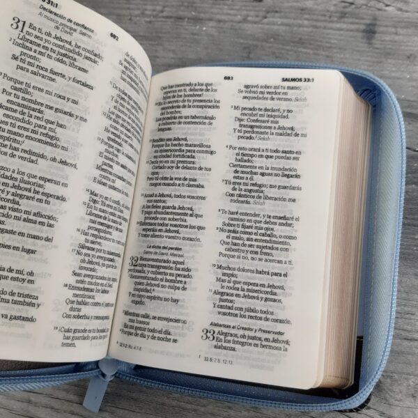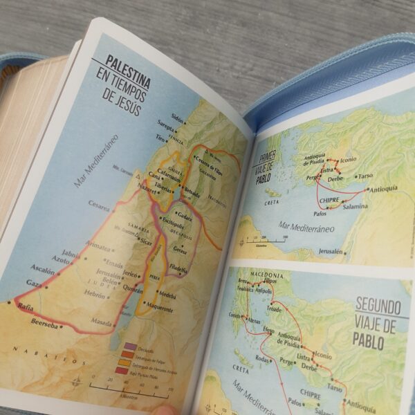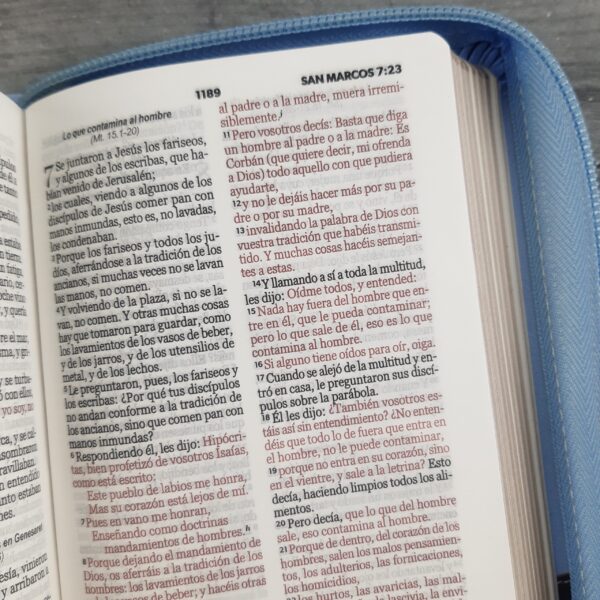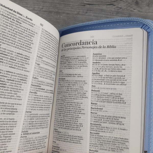 Biblia con cierre ,identifica las palabras de Jesús en rojo,Concordancia amplia de 120 páginas ,Concordancia de personajes bíblicos y Nombre personalizado en vinilo metalizado. Esta Biblia contiene adicional 32 páginas a todo color con ayudas.